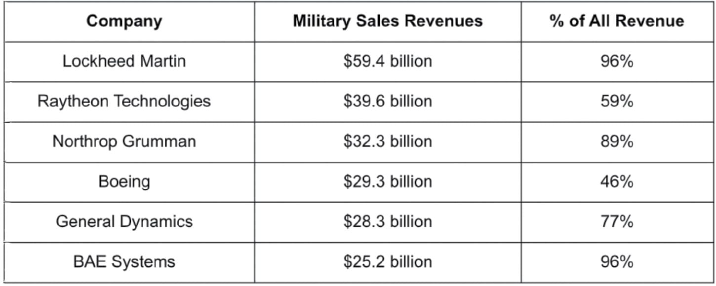 Fact: These six companies, in a typical recent year (2021), generated gross profits of $30.6 billion on $301 billion in revenues. Between 46% (Boeing) and 96% (Lockheed Martin) of those revenues came from selling weapons systems.