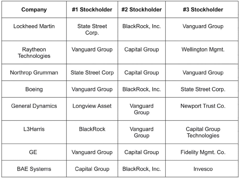 The big banks and investment firms are in actuality, the foremost propellants of the war industry’s influence.... When war corporations are merging or acquiring other corporations ... banks like Goldman Sachs and Morgan Stanley serve as financial advisors. The top five investors in shares of Lockheed Martin are giant financial firms.... They know war production is a reliable, steady investment.