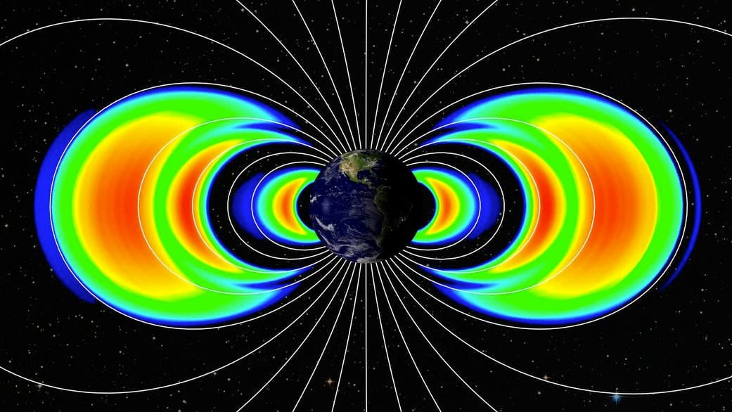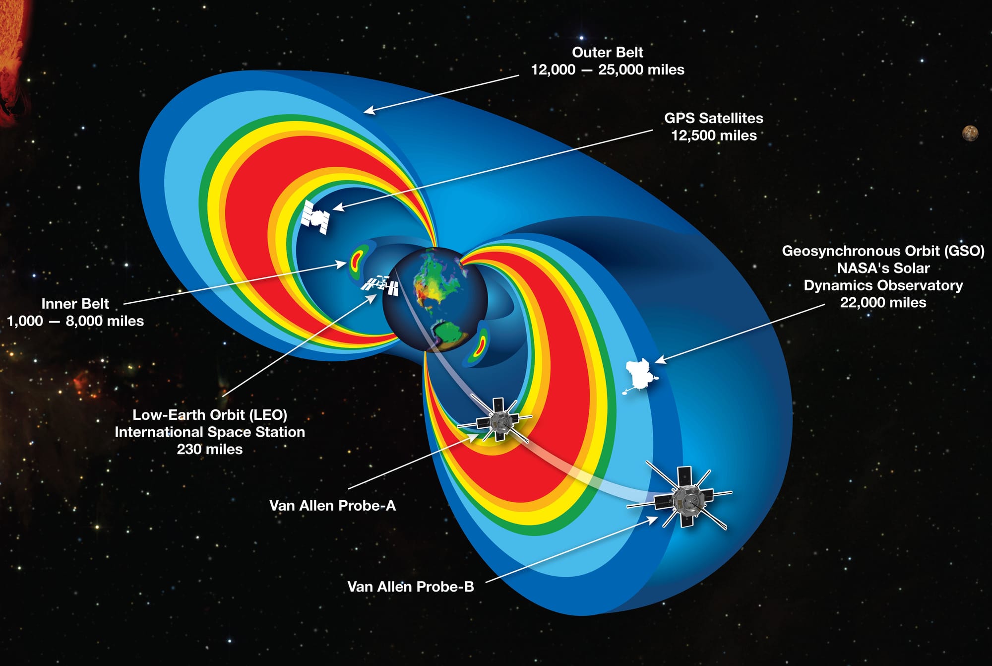 The Van Allen Belts, named after their discoverer, James Van Allen, are zones of energetic charged particles, most of which originate from the solar wind, which have been captured by and are held in place by the Earth’s magnetic field (the magnetosphere), taking the form of a torus (a donut or tire shape) around the Earth. These belts extend from about 965 km to over 21,100 km above the Earth. One can get a sense of Earth’s magnetic fields by looking at the Aurora Borealis, which is the result of collisions of electrically charged particles released from the Sun with gases in Earth’s atmosphere, and which travel along the field lines of the magnetic poles.