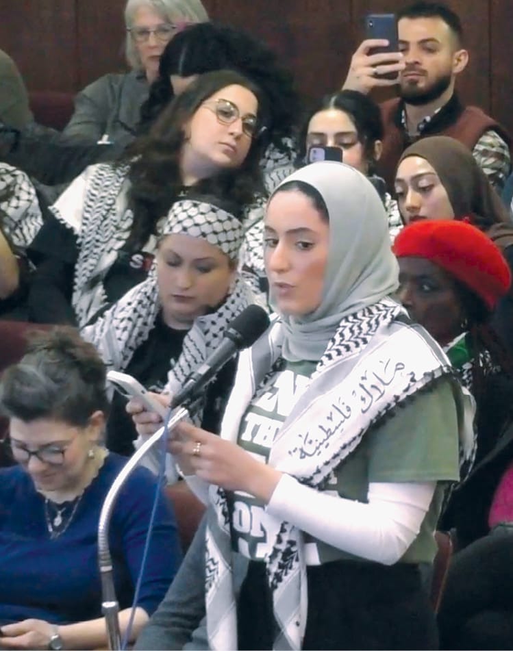 Young people, especially highschoolers, turned out in force, with 10 schools organizing a walk-out in support of the ceasefire resolution today. One thousand students lined up early in the cold Chicago morning before City Hall even opened, having marched from their schools. Organizers reported that, by their count, there were at least 5,000 people assembled outside and inside City Hall, waiting for three hours to hear the news of the vote. In the lobby, protesters were chanting “Ceasefire now!” and directed calls at Alderman Silverstein—the main opponent of the ceasefire resolution, saying: “Silverstein, you can’t hide, you’re supporting genocide!”
