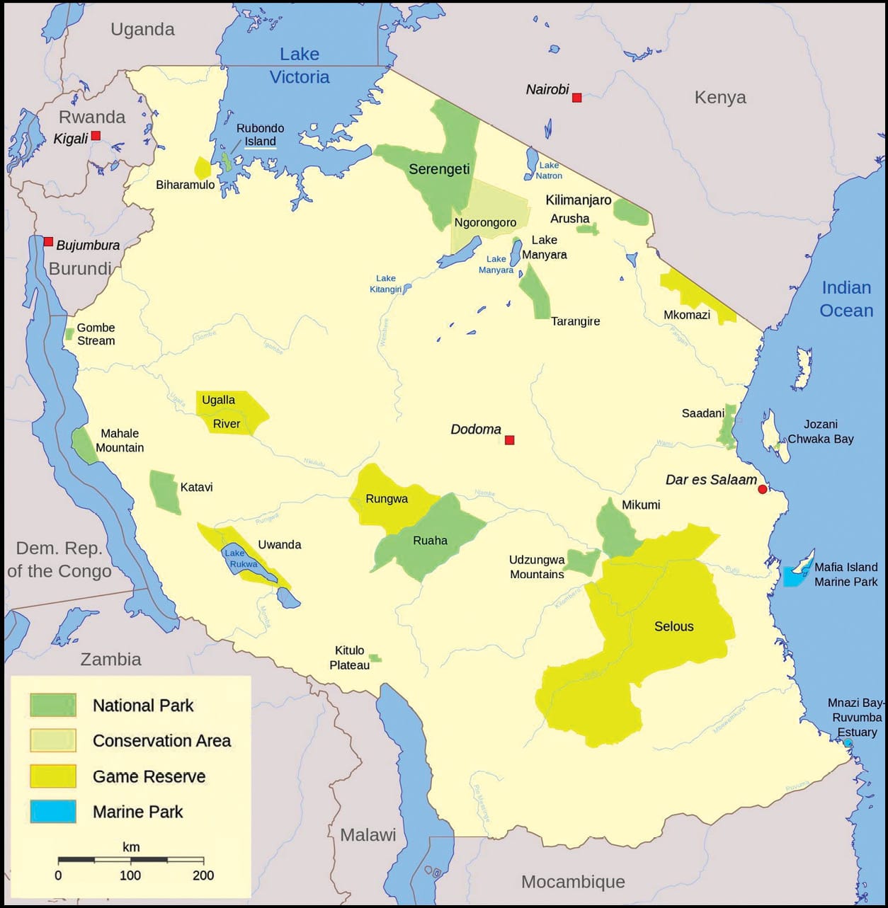 As for national parks, France has 26,168 km² of national parks, but half of that is taken up by the Guiana Amazonian Park in French Guiana. By contrast, Tanzania’s national parks cover an area of 99,306 km², approximately the land area all the Benelux countries plus Switzerland. Adding up all protected areas and national forests, where hunting and logging is strictly controlled, if not forbidden, the area increases to 361,594 km², more than a third of the land area of the country and larger than the entire land area of Germany! In addition to the Selous Game Reserve, there are 21 other national parks, including the famous Serengeti National Park which covers 14,763 km² (more famous, but much smaller than Selous).