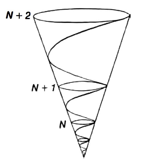 Later, with the work of Gauss, Dirichlet, Riemann, and Weierstrass, we have the higher geometry of the Gauss-Riemann complex domain. This latter domain, in which the characteristic form of functions is associated predominantly with elliptic and hyperbolic trigonometries, is generated by replacing circular with self-similar spiral forms of multiply-connected least action (Figure 3).