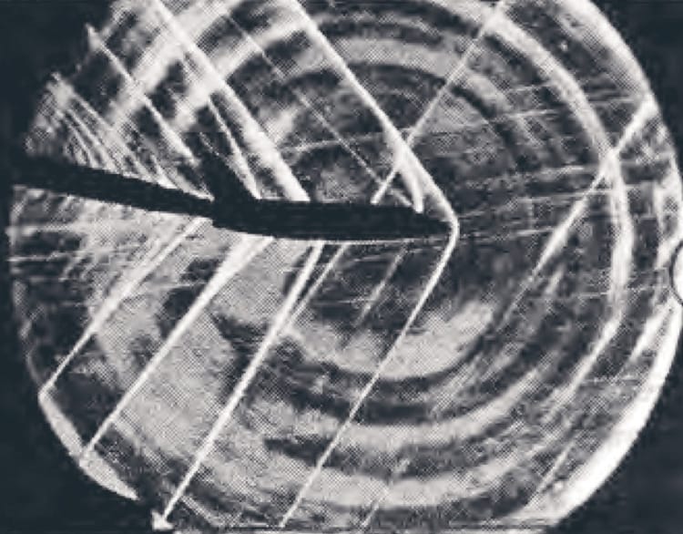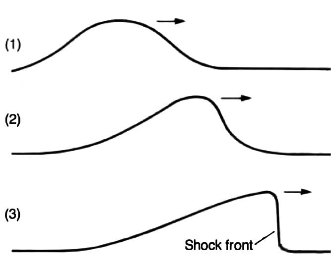 Bernhard Riemann’s most significant contribution was to prove that the standard mathematical methods used in theoretical physics do not work. Riemann’s 1859 paper, “On the Propagation of Plane Air Waves of Finite Amplitude,” demonstrates how under certain conditions an intense sinusoidal air wave will change its form as it moves, transforming itself into a shock front across which a discontinuous change of pressure occurs (see Figure 4). Up to the point of formation of the shock front, the propagation of the wave appears to be adequately described by the usual differential equations of hydrodynamics. At the formation of the shock front, however, some of the parameters of these equations assume infinite values. The process has assumed new characteristics; a singularity has been formed.