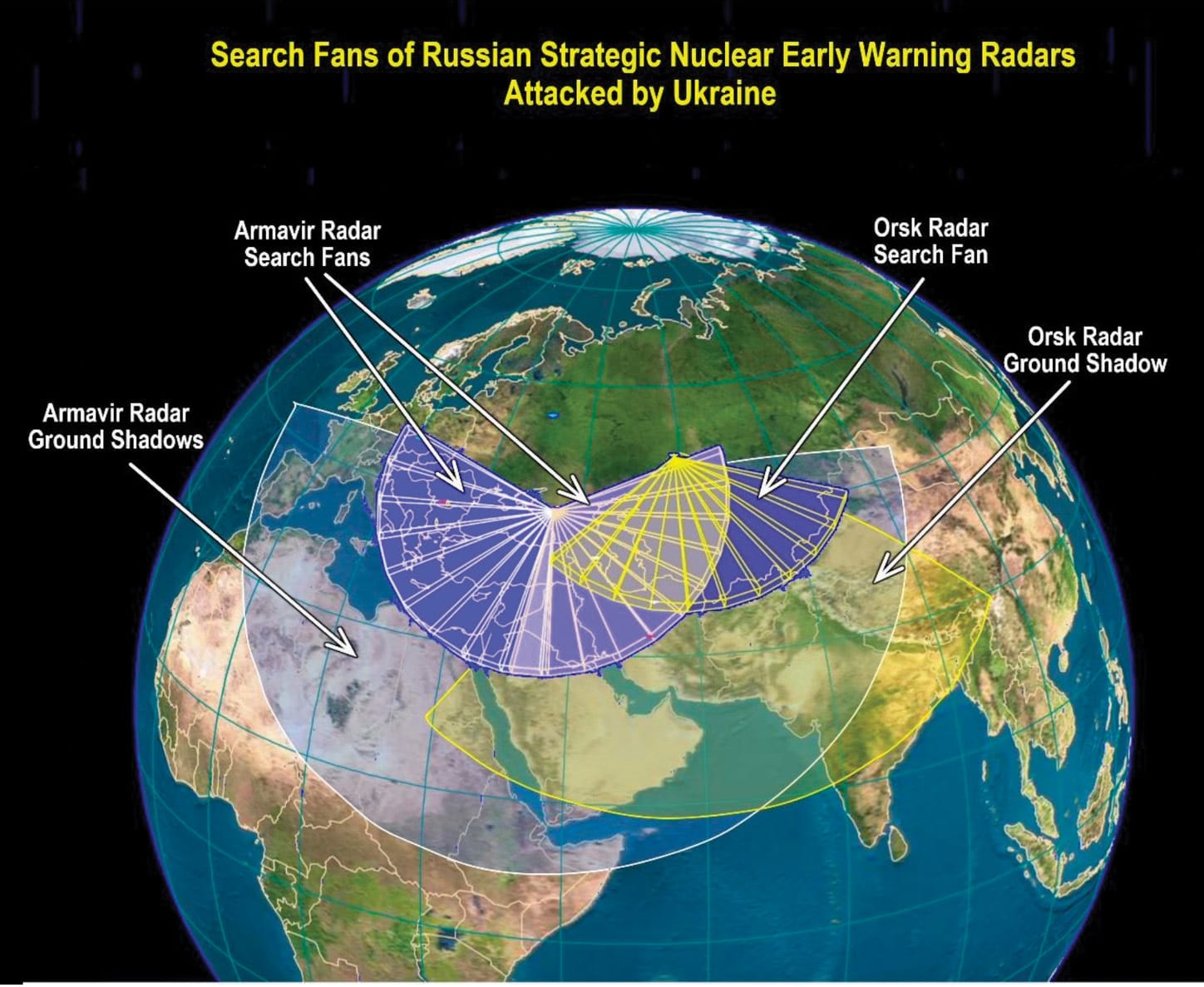 There are two radar fans on the left side of your screen that are overlapping slightly at the middle. Those are the radars at Armavir. Each can look into an azimuth of about 120°; so between the two radars, you can cover an azimuth of about 240°. To the right is the radar fan at Orsk, and that’s also a 120° fan.