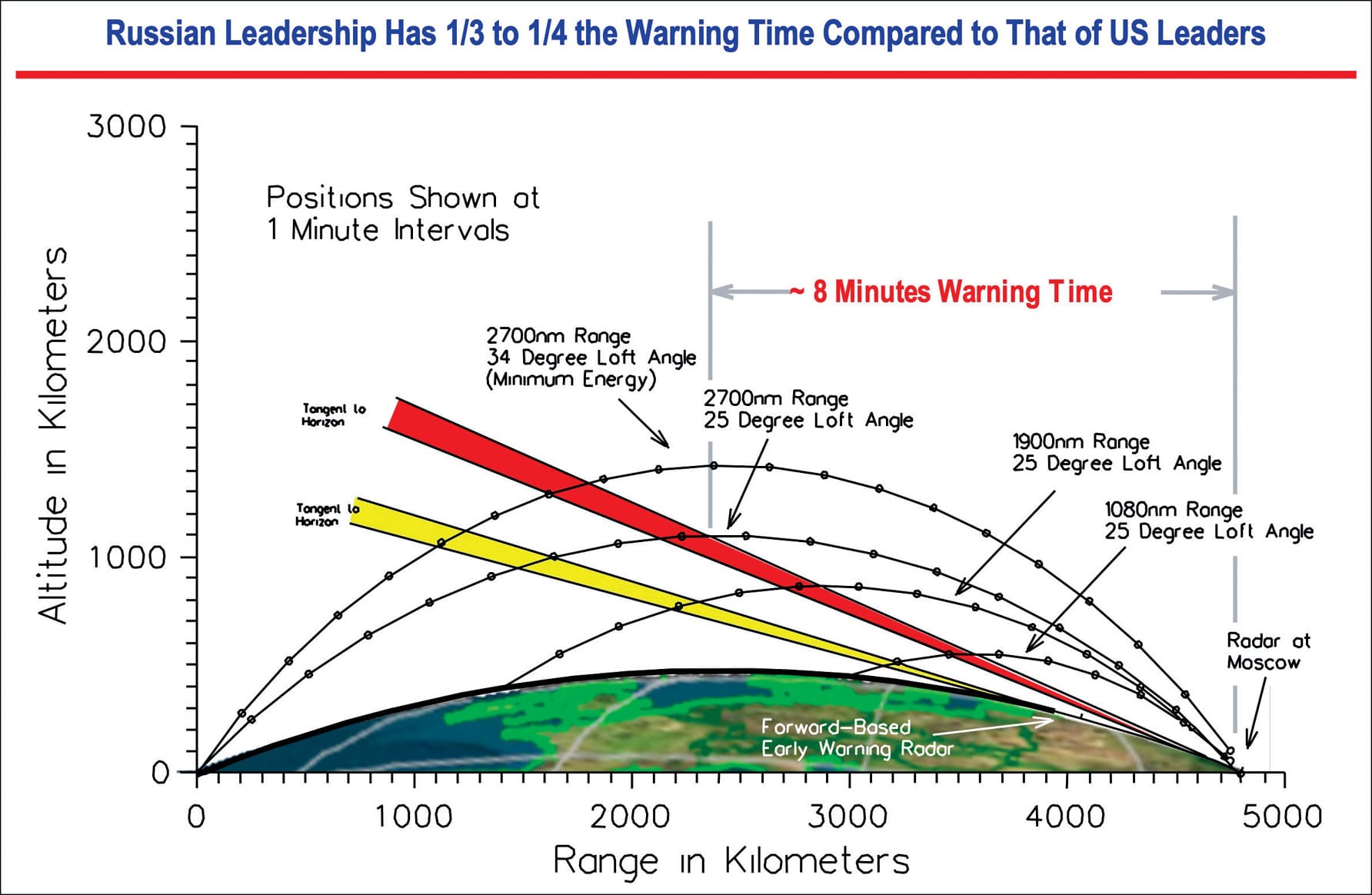 So, if you look at the far left side [of the second slide], you can see [that] one, two, three, four, five, to six minutes after launch, you would begin to travel through the radar fan that is forward of Moscow. This particular radar fan is placed about 1,000 km forward of Moscow. It’s not exact, relative to the fans at Armavir and Orsk, but it generally is good enough for illustrating the issues.