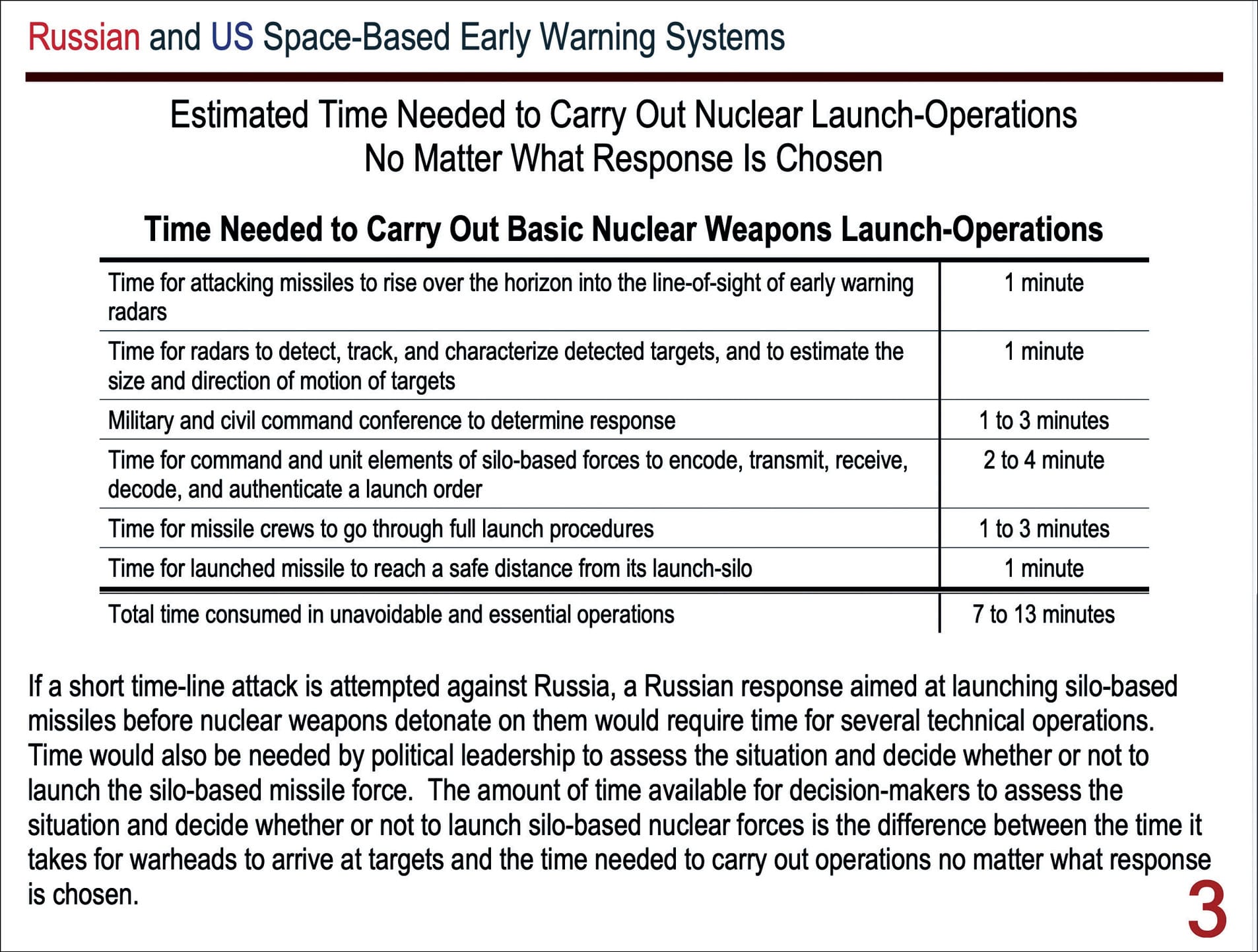 “Time for command and unit elements of the silo-based forces to react to a launch order,” two to four minutes; that again, is a number for an American system. “Time for missile crews to go through full launch procedure,” one to three minutes; that’s going to be the same for Russians and Americans. And then, we have “time for the missiles to launch from their silos.” They have to get far enough away from their silos—and it takes a minute or two—because if warheads are detonating on the ICBM silo fields, the blast waves from those warheads, even though they’re relatively low-pressure, … the ICBMs will be destroyed. So, they have to be flying out, they have to get out of the air atmosphere above the silo fields.