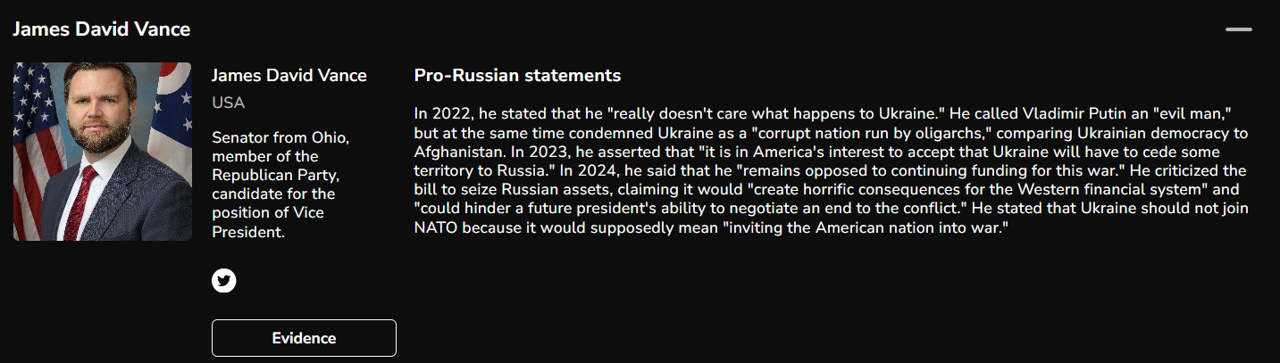 Molfar’s MO is to publish the personal details of its targets and their closest family members; so far, Senator Vance’s family has been spared this action.