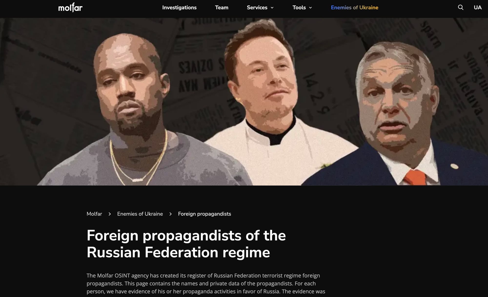 Molfar functions as a key targeting agency for Ukrainian military and intelligence agencies, while simultaneously packaging NATO propaganda for publication as “Ukrainian OSINT” by its multiple top Establishment media “partners.” It files its “Foreign Propagandists” list under the category of “Enemies of Ukraine,” who, it demands, must be treated as “a threat to the national security” and subjected to “removal from public positions, the introduction of sanctions, and investigations into personal involvement in crimes.” In addition, Molfar is often cited as an “authoritative” source by Establishment media.