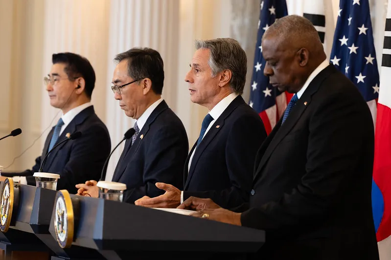 The U.S.-Republic of Korea 2+2 meeting of foreign and defense secretaries held in Washington yesterday served, among other things, to jack up the U.S./NATO confrontation with Russia. Secretary of State Antony Blinken, during a joint press conference with Secretary of Defense Lloyd Austin and South Korean foreign and defense ministers, said that the U.S. assesses that there are now 10,000 North Korean troops in Russia. “And the most recent information indicates that as many as 8,000 of those North Korean forces have been deployed to the Kursk region,” he said. “We’ve not yet seen these troops deploy into combat against Ukrainian forces, but we would expect that to happen in the coming days.”