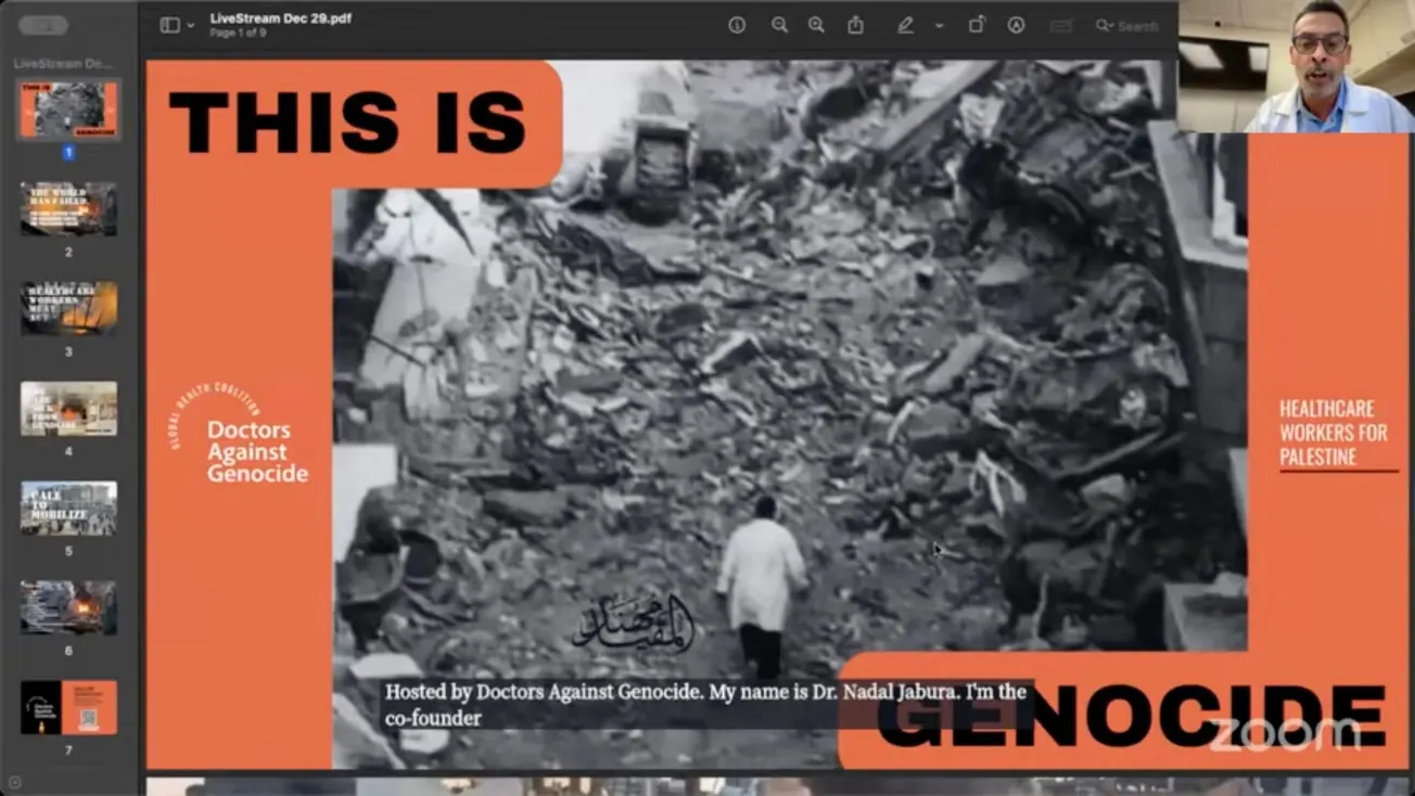 The livestream event, convened under the leadership of Doctors Against Genocide co-founder Dr. Nidal Jboor, included physicians from Gaza and those who had worked there recently—including Dr. Mark Perlmutter, as well as political commentators and activists such as Normal Finkelstein, Green Party presidential candidate Jill Stein, and Code Pink leader Medea Benjamin.