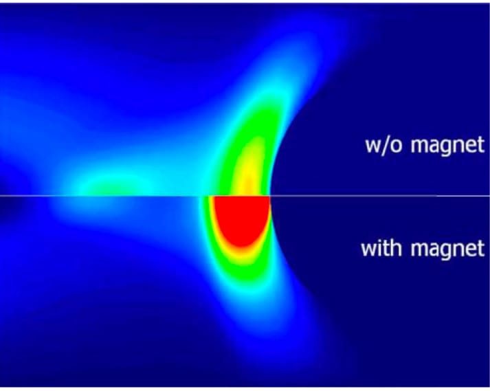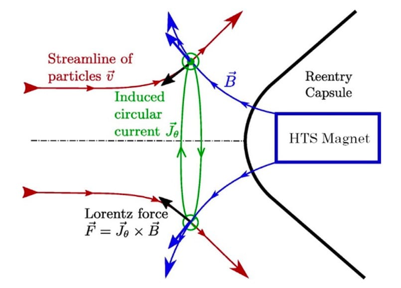 In this MHD technology, high-intensity magnetic fields are created in the vehicle; high-temperature superconducting (HTS) materials are required to produce the magnetic fields. The magnetic fields disrupt the shock wave, and push plasma out of the way so it does not retard the motion of the vehicle. The uses of magnetic fields in this manner are termed “magnetohydrodynamic” effects.
