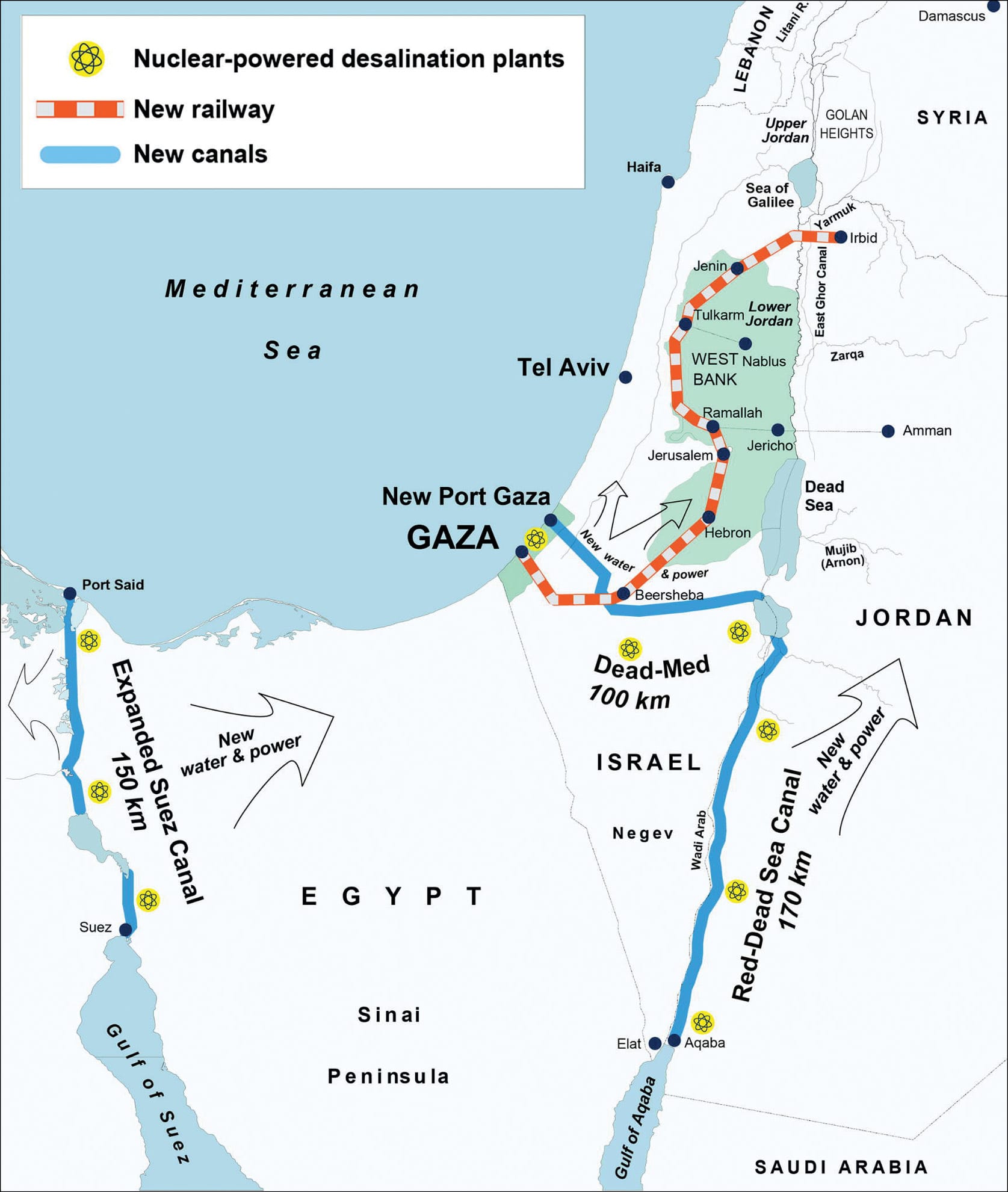 The plan in its new form developed by this author and his colleagues at the Schiller Institute in the last two years evolves in the context of the Belt and Road Initiative, or the New Silk Road, or the World Land-Bridge, which is also the brainchild of Lyndon LaRouche, and the connectivity of West Asia’s infrastructure and its utilization as a bridge between Asia, Europe and Africa on the one hand, and the Indian Ocean and the Mediterranean on the other. This is done by building development corridors throughout the region consisting mainly of transportation lines such as railways and highways, water, electric power, oil and gas pipelines, and building new agricultural and industrial zones and cities on both sides of these development corridors, which will extend to Palestine (from Jordan to the West Bank, to Gaza, to the Mediterranean Sea, and from there to Egypt).