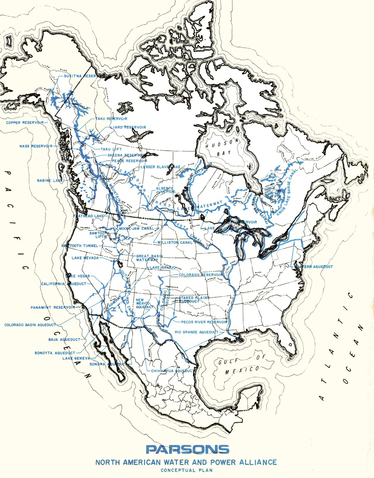 NAWAPA is a system of water conveyance that would divert runoff from the water-surplus areas of Northwest North America and bring it to the water-deficient Southwest through a series of man-made canals, using pumps, lifts, and a system of reservoirs. By doing so, it would enrich the system of transpiration and precipitation, transform local weather and perhaps climate, and increase the water’s overall productivity in photosynthesis and sustaining life.