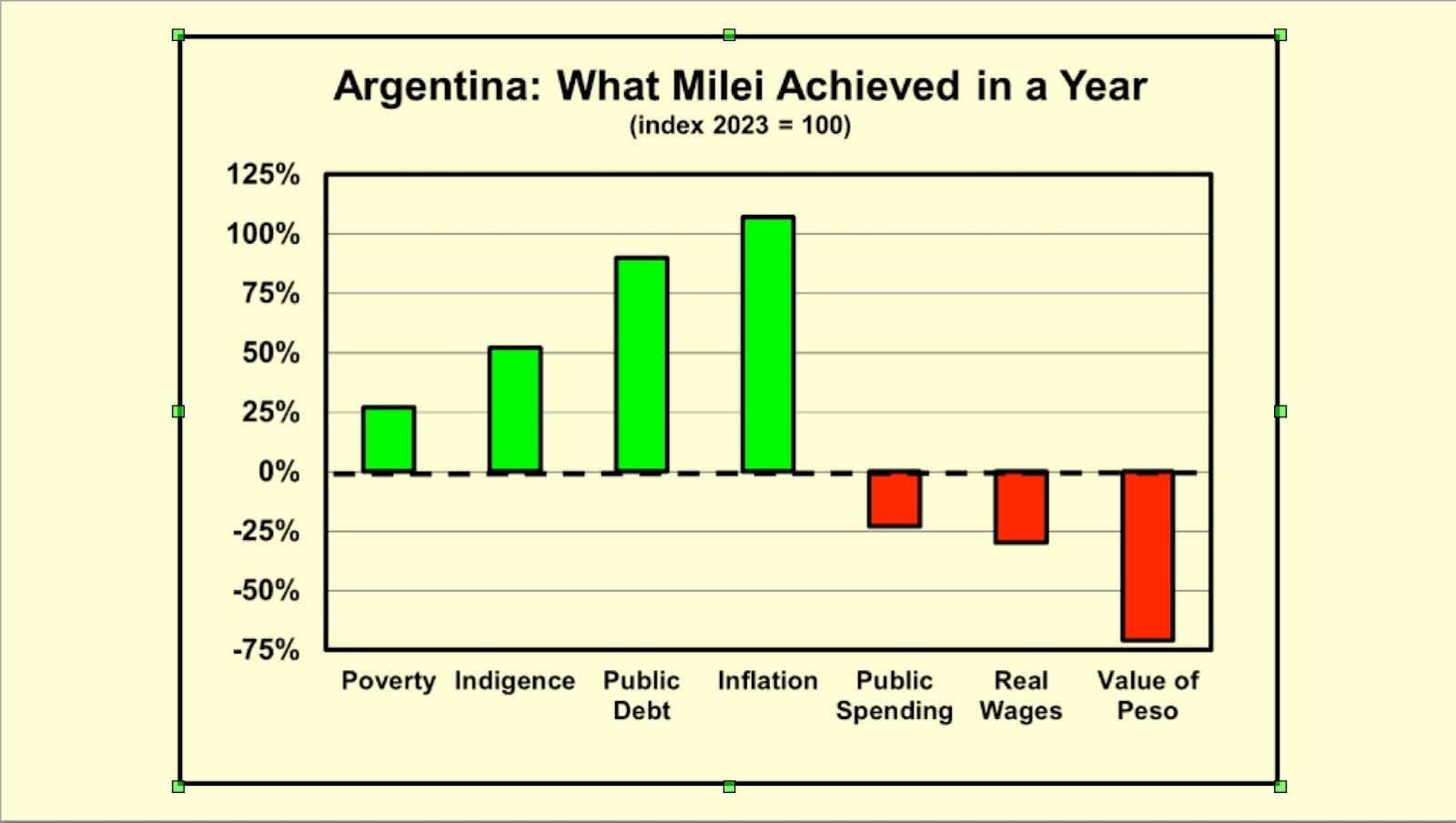 - Increasing inflation by 107%, from an already impossible 118% annual average when Milei took office in Dec. 2023, to a truly hyperinflationary 245% a year later.