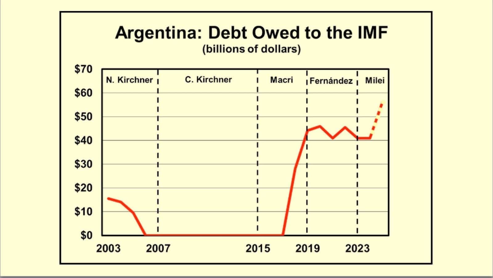 Fernández held off the creditor wolves and the IMF as best he could, with debt to the IMF dropping slightly to $41 billion—which is where it stands today. Argentina is, by far, the IMF’s #1 debtor, representing 28% of all IMF debt.
