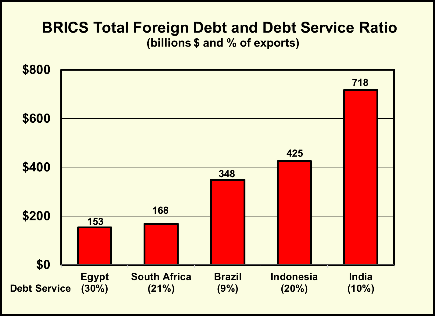 The BRICS 20 nations accounted for about $5.0 trillion (56%) of that total. If we leave aside China’s $2.4 trillion foreign debt, which is arguably distinct from all the others, that leaves “only” $2.6 trillion in foreign debt of the other BRICS 20 nations.