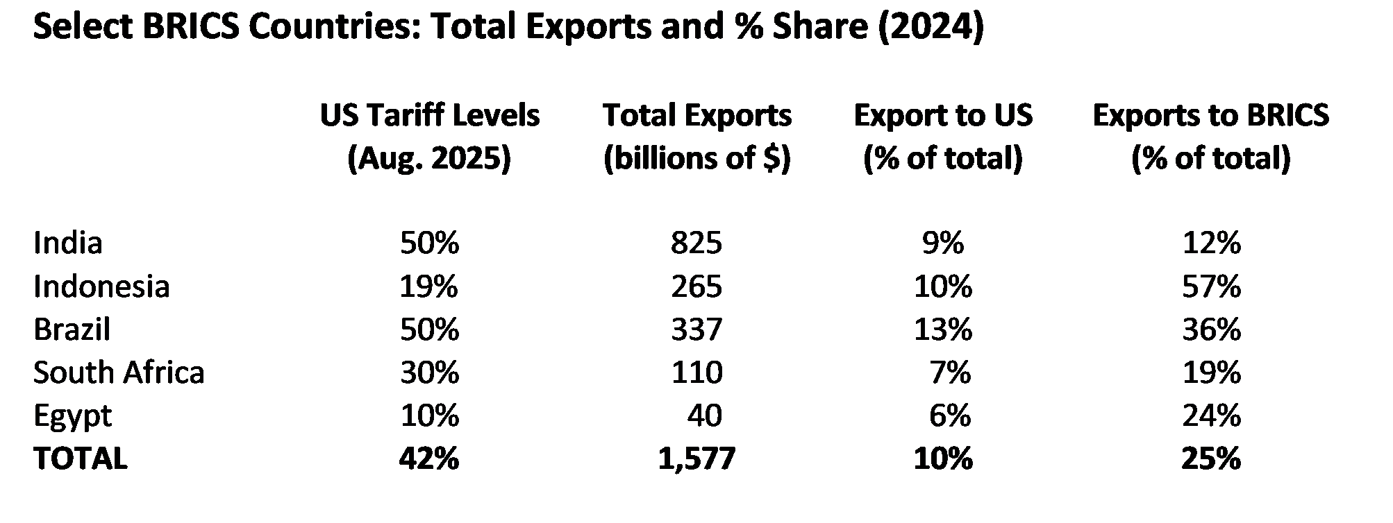 Fig. 3 shows the U.S. tariff levels being applied (as of August 2025) to each of the indicated five BRICS nations, which range up to 50%, which is the case for India and Brazil—which together owe over $1 trillion in foreign debt. The table also shows the share of each country’s exports going to the U.S., as compared to its exports shipped to other BRICS nations. In all cases, those five nations export substantially more to other BRICS nations than they do to the U.S. The weighted average of all five is: 10% of their exports goes to the U.S. (where they face a weighted average tariff of a stunning 42%); 25% of their exports goes intra-BRICS.