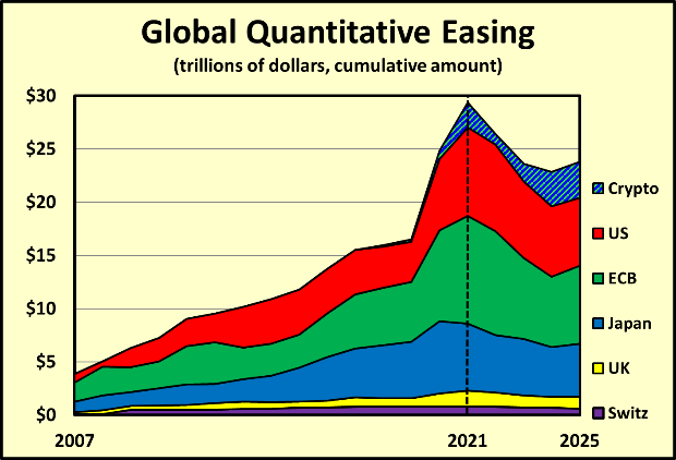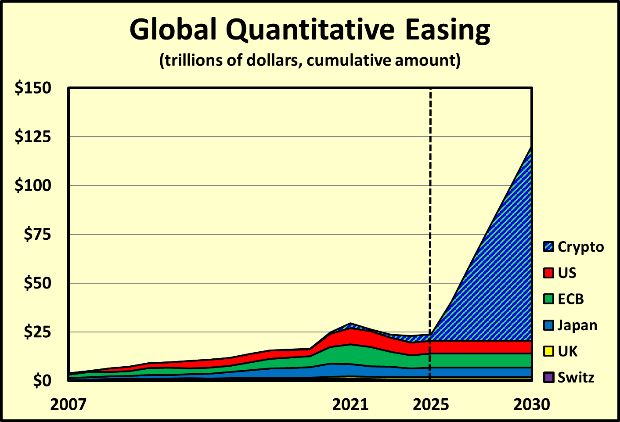 As Fig. 4 shows, QE had pretty much run its course as of about 2021, and an urgent financier-led drive was launched to pump new trillions of funny-money into the system, in the form of worthless, privately issued cryptocurrency (including so-called stablecoins)—up to $100 or even $200 trillion in new monetary assets by the year 2030, according to a number of sources, as Fig. 5 shows.