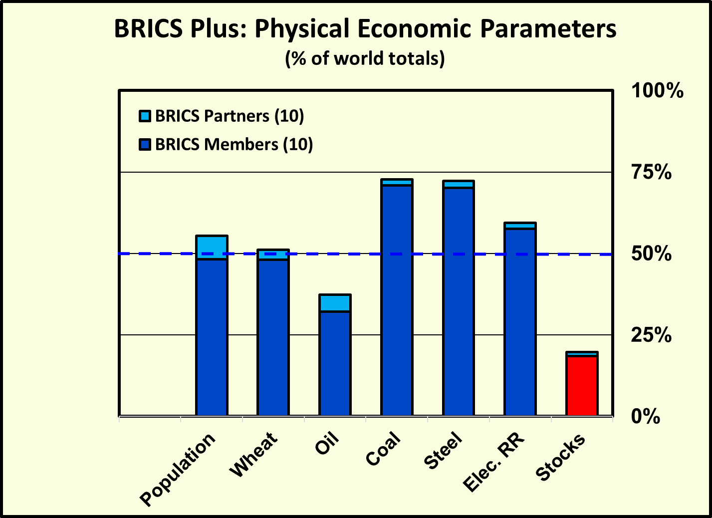 The BRICS 20 nations are well aware of the fact that they together represent 54% of the world’s population, and that they are strong—taken together—in other key physical economic parameters: 52% of global wheat production; 38% of oil; and nearly 75% of coal and steel (see Fig. 6). They are also aware that they can trade with each other using their own national currencies, rather than the toxic, speculation-ridden dollar, and they are increasingly doing just that. And they are studying technical mechanisms for establishing a unified clearing house and settlements system for their non-dollar trade.