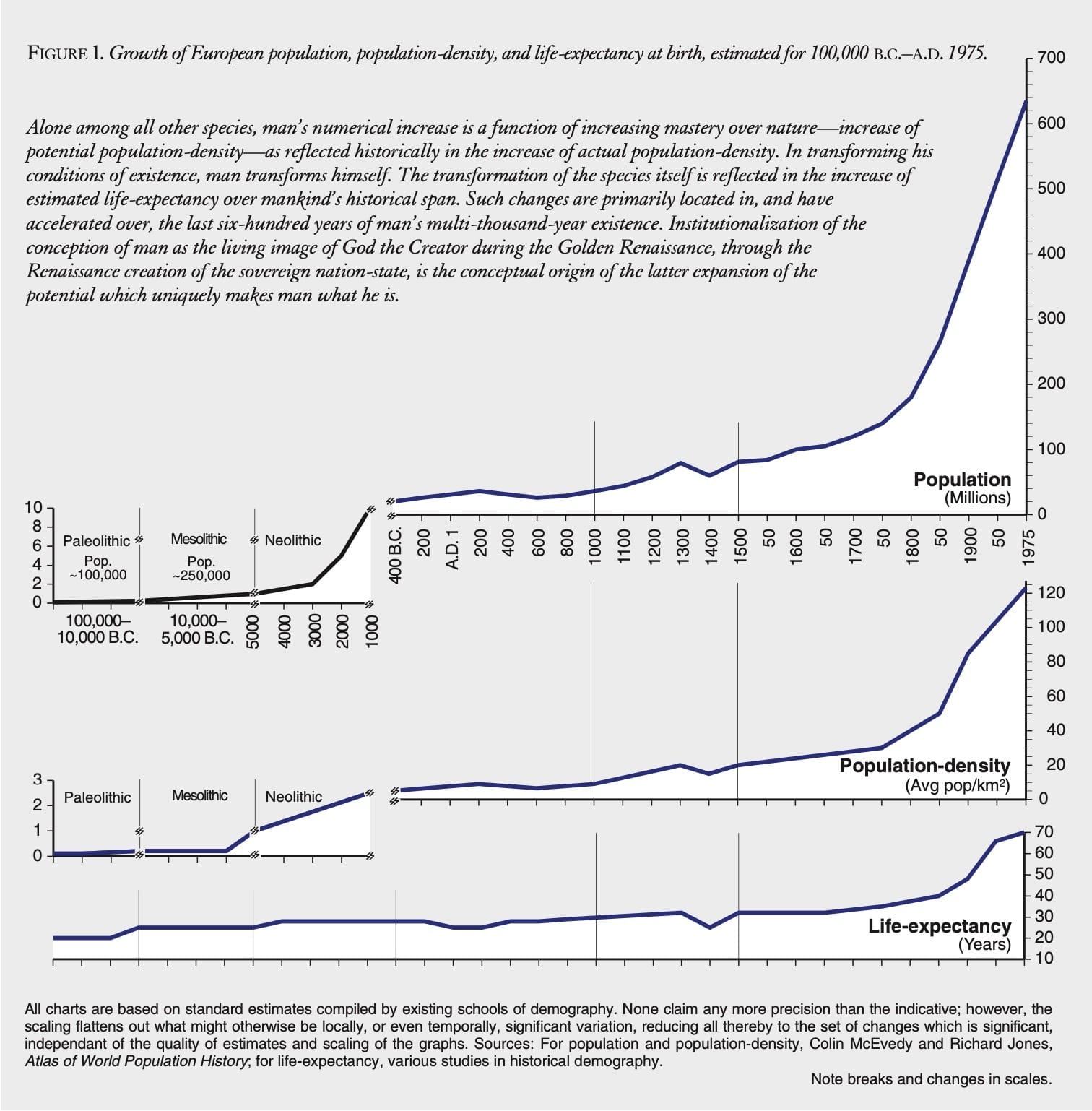 Consider the accompanying two figures, the chart of population curves from “How Bertrand Russell Became an Evil Man,” and the table of sample historical and pre-historical demographies which appeared in “Phil Gramm’s ‘Conservative Revolution in America.’ ”25 Whereas all “animal ecologies” are characterized by a fixed range of variability in potential relative population-densities for individual species, the demographic history of the human species is a long wave of successive rises in the population potential of mankind’s dominant cultures: through, and above an entire series of such successive ranges. As the most recent development, since Europe A.C.E. 1440, shows most clearly, the rate of advancement of human potential relative population-density apparently describes an hyperbolic function. In these terms, man appears to behave as a self-evolving succession of species, from lower to higher qualities of existence.