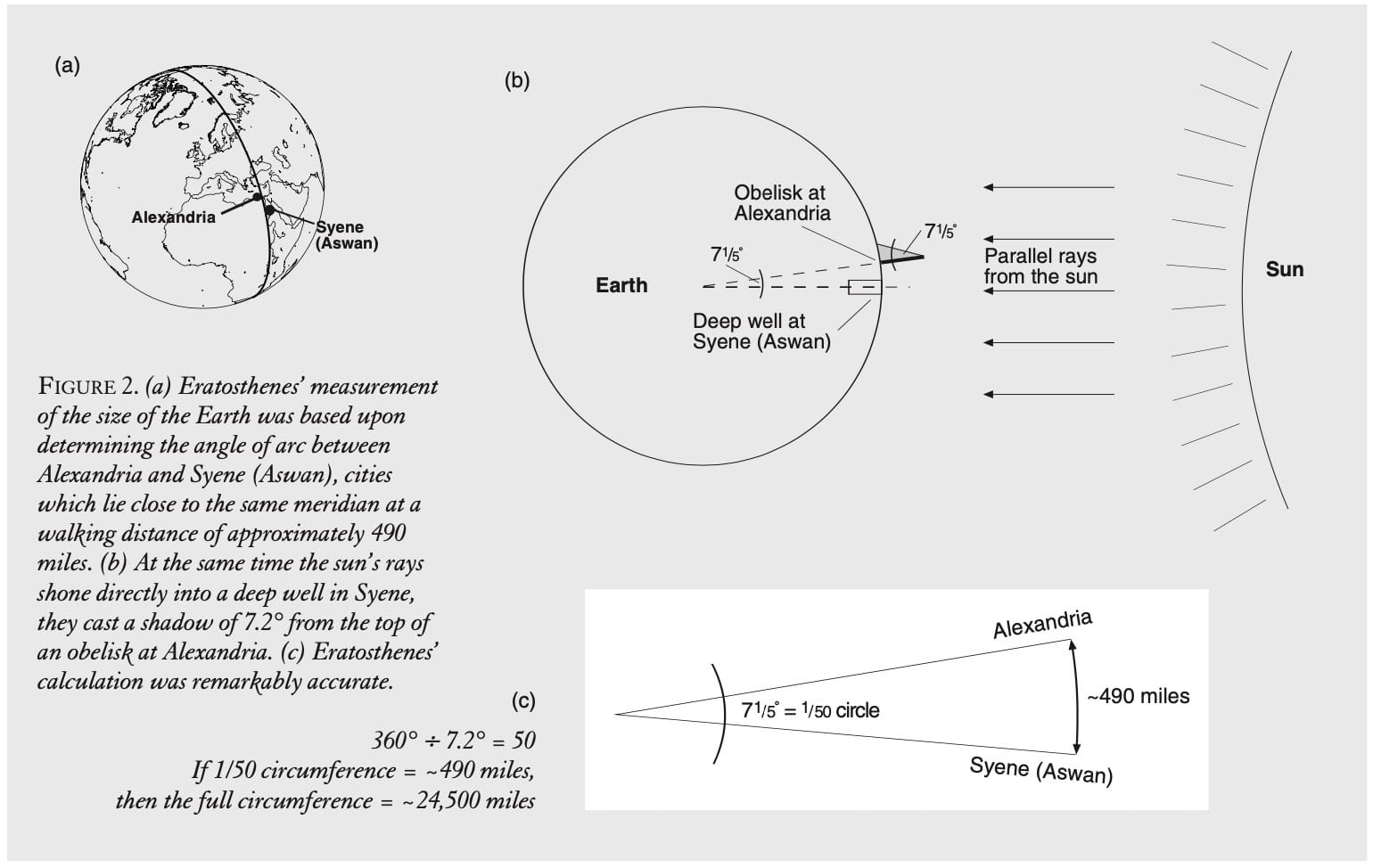 Consider as illustration, a student’s effort to replicate the measurement of the size of the Earth by the celebrated Eratosthenes.26 The crucial point to be emphasized by the teacher in guiding the student’s work, is that prior to the modern aerospace age, no person had ever seen the curvature of the Earth. Yet, following the method of Aristarchus, Eratosthenes, during the latter part of the Third Century B.C.E. estimated the length of the arc of a great circle (meridian) of the Earth with the gratifyingly small margin of error (considering the means available) of less than one percent (see Figure 2). The most crucial point here, is the discovery, that not only can one measure something which one cannot see, but one can show that that object has a type of existence efficiently opposite to what our senses seem to permit us to believe.
